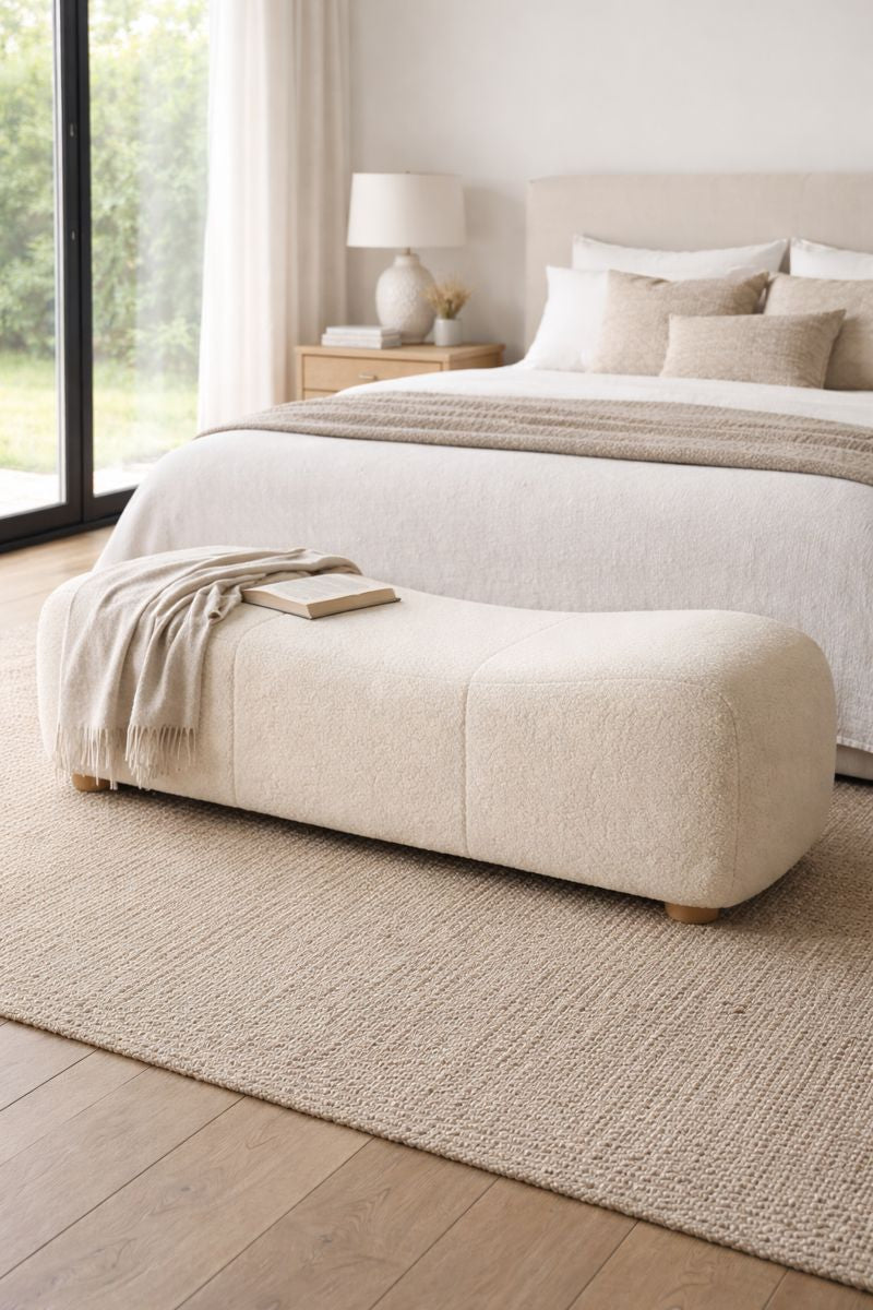 Esta banca de silueta curva y volumen envolvente destaca por su tapicería en tela bouclé, que aporta textura, calidez y un carácter contemporáneo. Su diseño continuo y sin aristas crea una presencia elegante y acogedora, ideal para colocarse al pie de cama, en un vestíbulo o como pieza protagonista en una sala. Disponible en tela bouclé y personalizable en cualquier tela según sus necesidades y estilo.