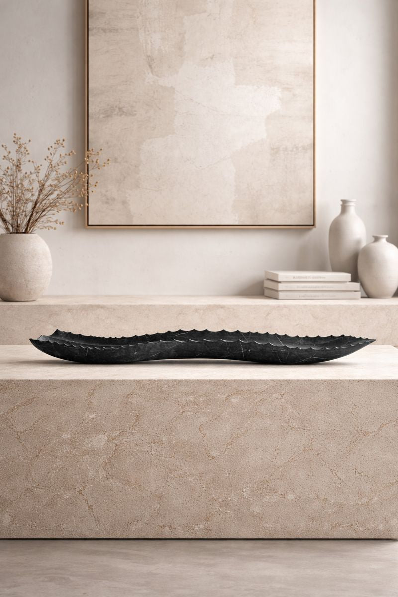 Inspirada en la fuerza y belleza orgánica del maguey, esta pieza escultórica en mármol natural destaca por su silueta alargada y bordes sutilmente serrados que evocan el movimiento y la textura de la hoja. Cada escultura es tallada en piedra natural, por lo que sus vetas, tonos y matices son únicos, convirtiéndola en una obra decorativa irrepetible.
