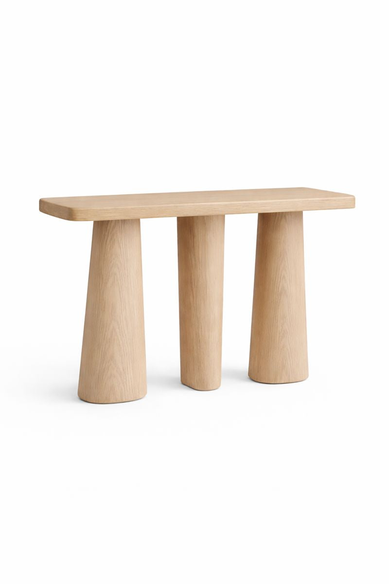 Consola elaborada en madera sólida, con un diseño de líneas limpias y presencia escultórica. Su estructura robusta y proporciones equilibradas la convierten en una pieza funcional y decorativa, ideal para recibidores, pasillos o espacios sociales.