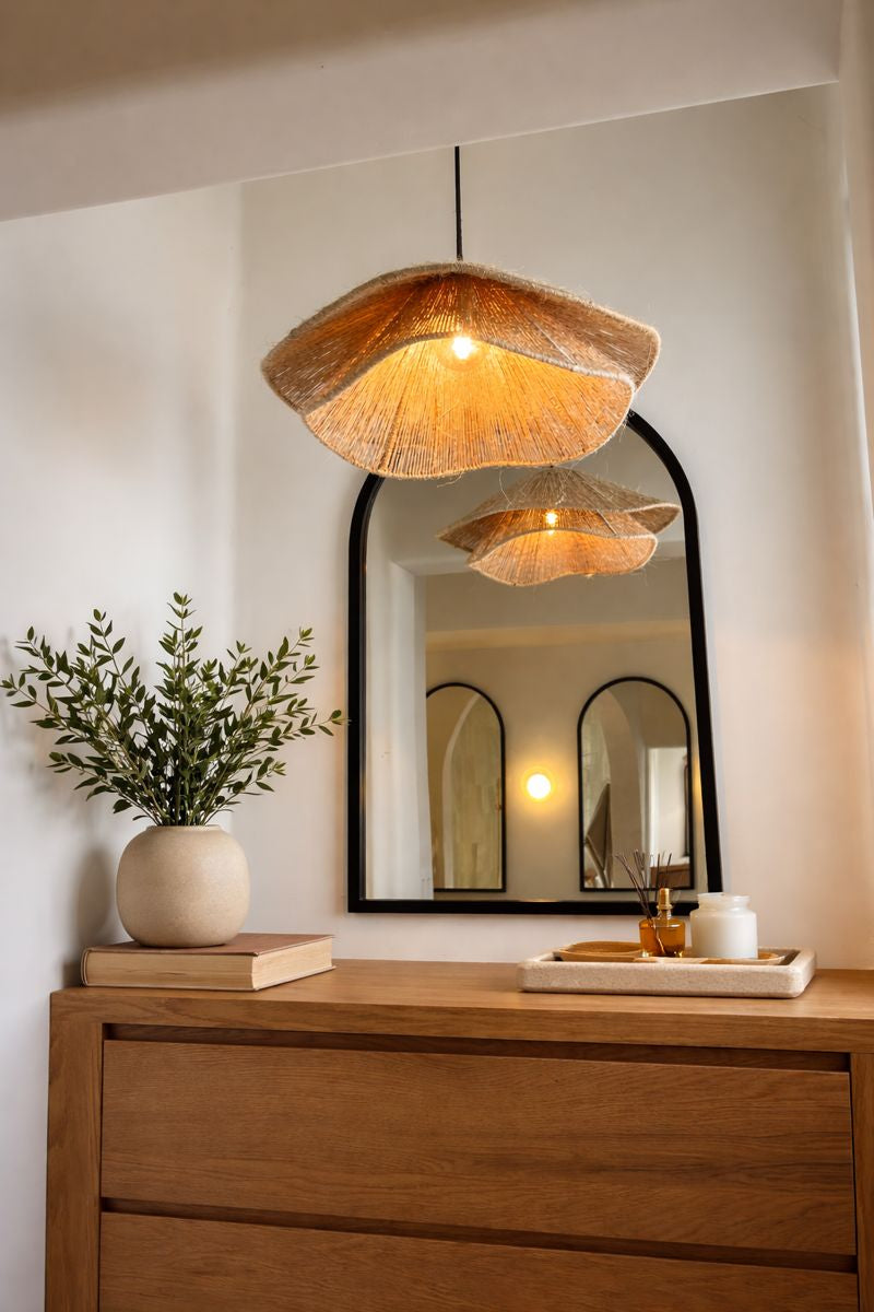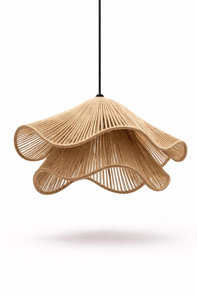 Lámpara colgante elaborada artesanalmente en yute natural, con un diseño orgánico y escultórico que aporta calidez y textura al espacio. Su tejido permite el paso de la luz de forma suave, creando una iluminación ambiental acogedora y natural.