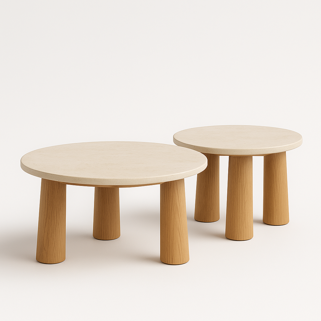 Set de mesas de centro con cubiertas de mármol gris natural con veta blanca y bases de madera sólida en tono cálido. Su diseño equilibrado y proporciones compactas lo hacen ideal para salas contemporáneas, aportando textura, contraste y un carácter atemporal.